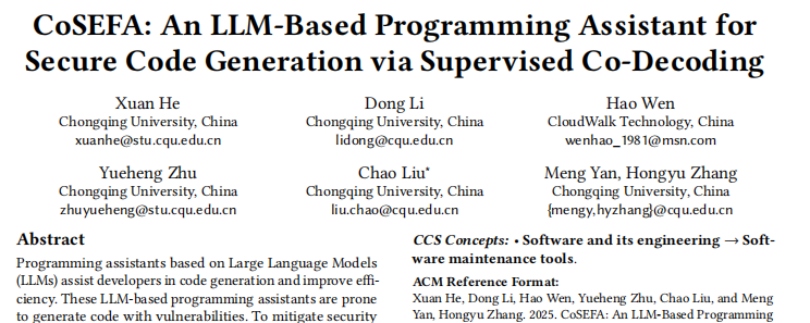 近日,云從科技與重慶大學(xué)大數(shù)據(jù)與軟件學(xué)院聯(lián)合研發(fā)的編程智能體——CoSEFA(Code SEcurity and Fix Agent)被軟件工程領(lǐng)域頂尖會議ACM SIGSOFT軟件工程基礎(chǔ)國際會議(FSE 2025)正式錄用。